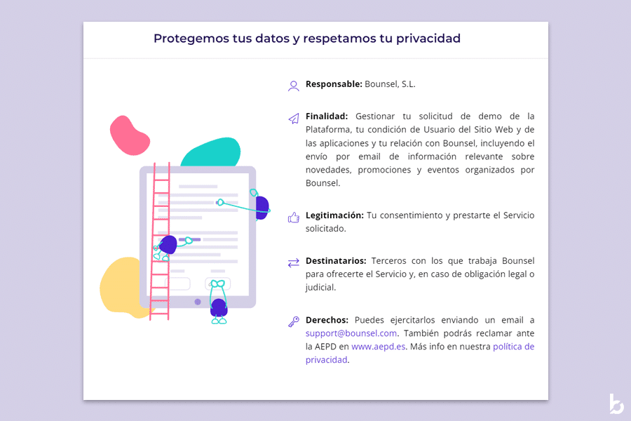 Un ejemplo claro sobre la utilización del Legal Design es la forma en la que está representada la política de privacidad de Bounsel. En lugar de tener un texto largo con una infinidad de detalles, conceptos difíciles de entender y detalles que complican la lectura, las condiciones están diseñadas así: