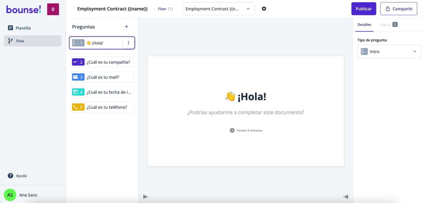 Posteriormente, podrás crear un flow, que consiste principalmente en crear preguntas asociadas a estas variables para que cualquier persona; tus clientes, colaboradores o proveedores puedan responderlas, al mismo tiempo que completan el documento. Así de simple funciona el software bufete de abogados, Bounsel Flow.