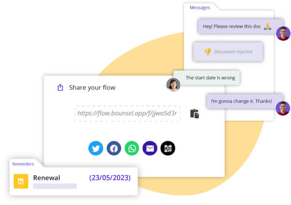 Comparte un flujo para crear contratos al instante, recibe comentarios en tu espacio de trabajo cuando solicites aprobaciones y crea recordatorios para que tu equipo no vuelva a incumplir un plazo.